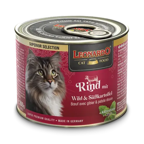 Venison and Beef: Lean, high-quality beef and offal, tastefully complemented with savory venison and wild boar meat – a variety that will satisfy even the most discerning carnivores. The gentle creaminess of sweet potato not only adds another unique flavor dimension but also provides valuable fiber. The added salmon oil gives the coat a silky shine with its polyunsaturated fatty acids.
