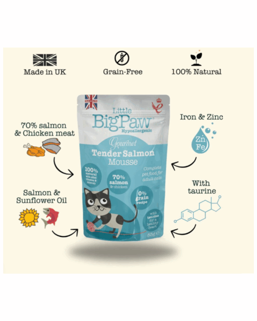 | Composition | Salmon 26%, Chicken 24%, Chicken liver 20%, Chicken liver 20%, Minerals, Salmon oil 0.1%, Sunflower oil 0.1% |